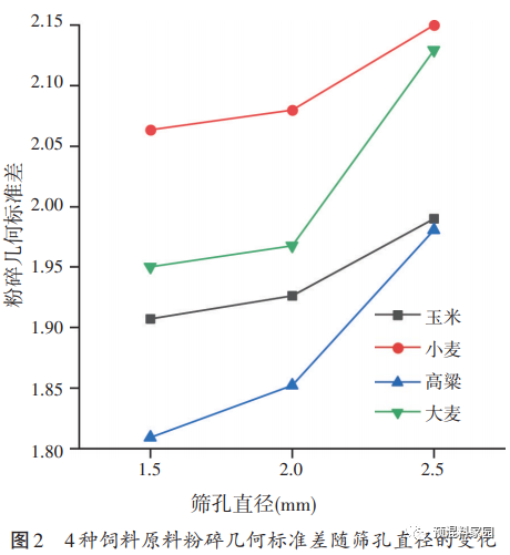 2 結果與分析2.1 不同飼料原料粉碎特性的差異性2.1.1 篩孔直徑對平均粒徑及粉碎均勻性的影響飼料的粉碎粒徑和均勻度通常用幾何平均粒徑和粒度幾何標準差表示。粉碎機的篩片孔徑、篩片厚度、開孔率等都是影響粉碎粒徑的因素,而篩片孔徑大小對粉碎粒徑的影響最大。有研究表明,大麥粉碎的幾何平均粒徑受篩片孔徑顯著影響,粉碎玉米的幾何平均粒徑隨著粉碎機篩片孔徑的增大線性增加,飼料原料粉碎的幾何平均粒徑隨篩片孔徑的增加而增加。本研究中,玉米、小麥、大麥、高粱 4 種飼料原料的幾何平均粒徑均隨篩片孔徑的增大而增加,與現(xiàn)有研究結論一致[9-10]。4 種飼料原料在 3 種篩孔直徑下的平均粒徑變化規(guī)律如圖 1 所示,4 種原料均呈現(xiàn)出相同的規(guī)律,即粉碎樣品平均粒徑隨篩孔直徑的增加而增加。當篩孔直徑由 1.5 mm 增加到 2.5 mm時 ,玉 米 的 粉 碎 平 均 粒 徑 由 400.10 μm 增 加 到520.00 μm,小麥的粉碎平均粒徑由 382.36 μm增加到 441.02 μm,高粱的粉碎平均粒徑由 373.36 μm 增加到 430.00 μm,大麥的粉碎平均粒徑由 448.23 μm增加到523.98 μm。由表2可見,4種飼料原料的粉碎樣品平均粒徑均受粉碎機篩孔直徑顯著影響(P