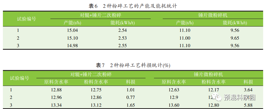 飼料廠廣義的損耗是指在進、出廠過程中的損失,包括變質損壞。對于原料則具體指倉儲損耗和生產環(huán)節(jié)料損兩類[14]。生產環(huán)節(jié)的料損具體分為投料殘余、除塵設備、工藝和成品計量,而工藝中的料損主要歸結于粉碎導致的水分損失,故本研究中料損同樣定義為粉碎前后物料含水率的損失。2 種粉碎工藝的料損值見表 7。對 2 種粉碎工藝進行多個工作日的監(jiān)測,可以得出,對輥+錘片二次粉碎工藝料損變化范圍為 0.77%~1.65%,而錘片微粉碎機料損最小值為 3.02%,最大值甚至高達 5.88%,即對輥+錘片二次粉碎工藝相較于錘片微粉碎機具有更少的料損。