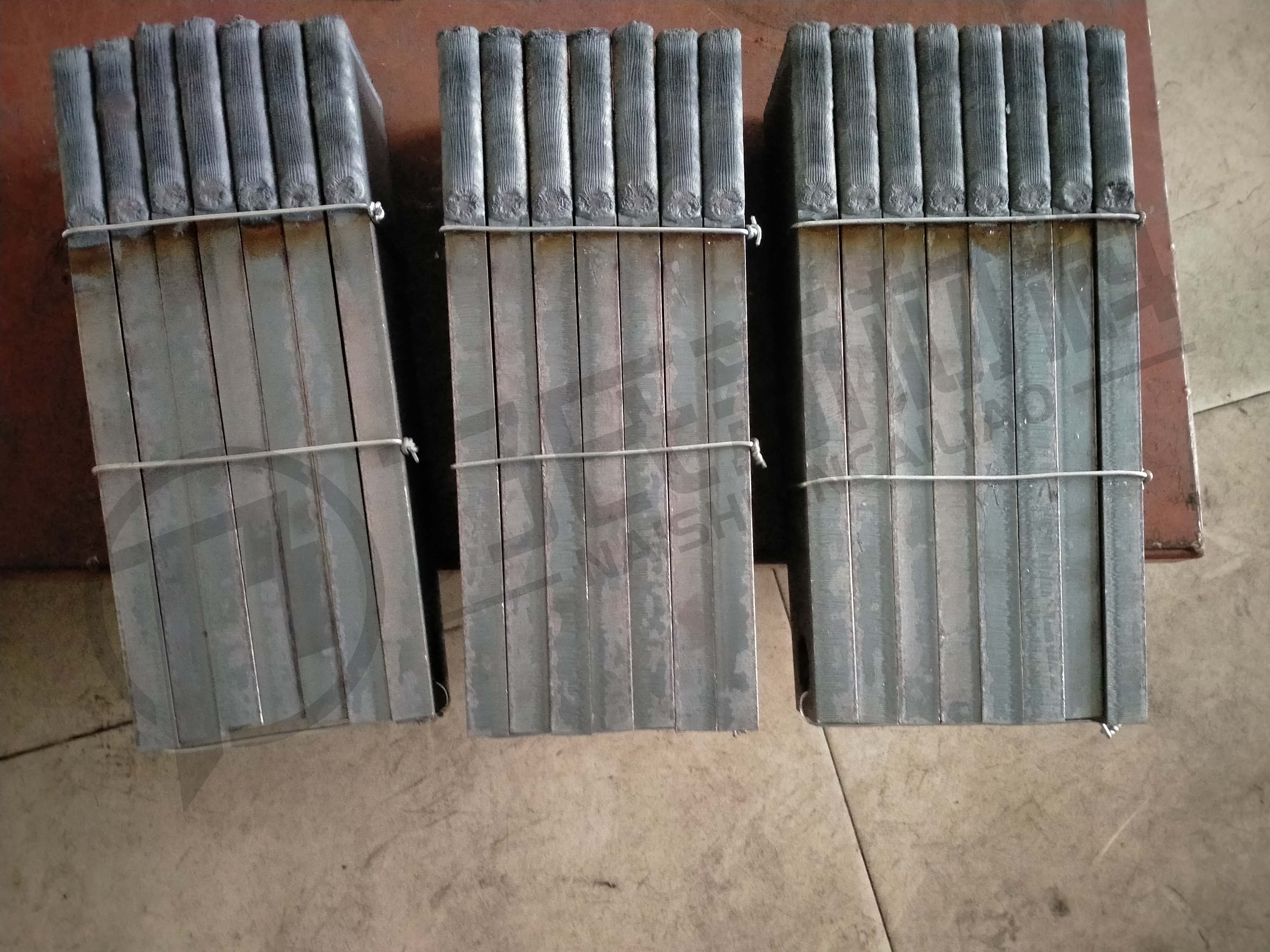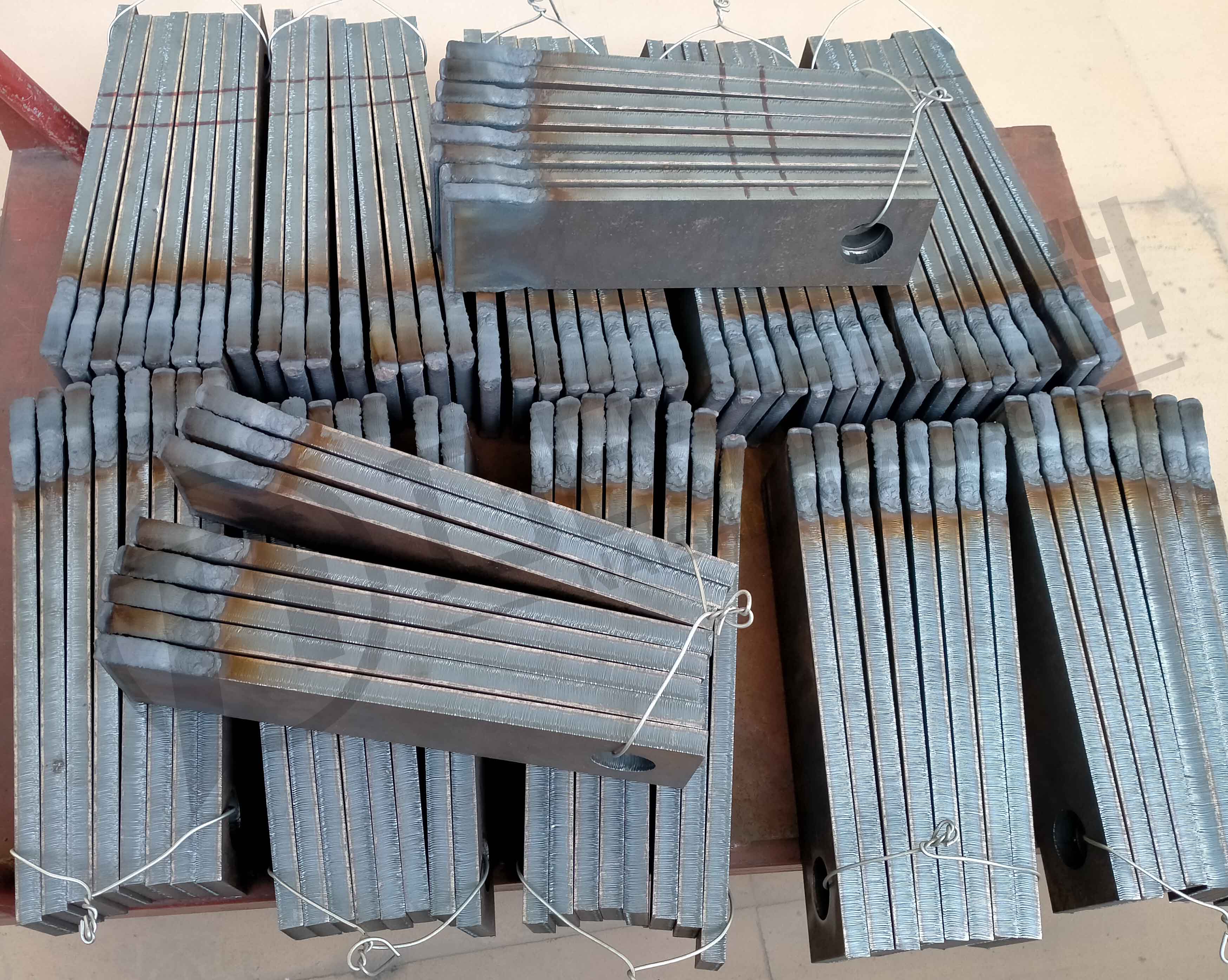 堆焊耐磨合金錘片,采用高強度耐磨合金鋼基體+高能量熔覆高硬合金粉末,一體自動化成型工藝,并經熱處理調質。該錘片具有硬度高、特耐磨、抗沖擊的優點,可定制各種型號。特點